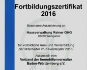 Hausverwaltung Reiner erhält das Fortbildungszertifikat 2016