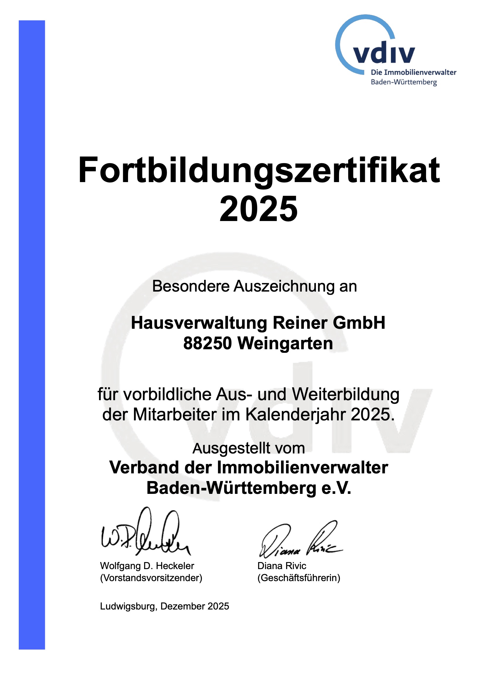 Fortbildungszertifikat 2023 Hausverwaltung Reiner GmbH