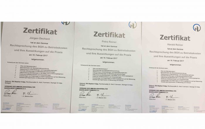 Für vorbildliche Aus- und Weiterbildung der Mitarbeiter im Kalenderjahr 2016, erhielt die Hausverwaltung Reiner das Fortbildungszertifikat 2016. Das Zertifikat wird durch den Verband der Immobilienverwalter Baden-Württemberg e.V. [...]