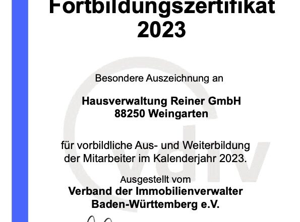 Fortbildungszertifikat 2023 Hausverwaltung Reiner GmbH