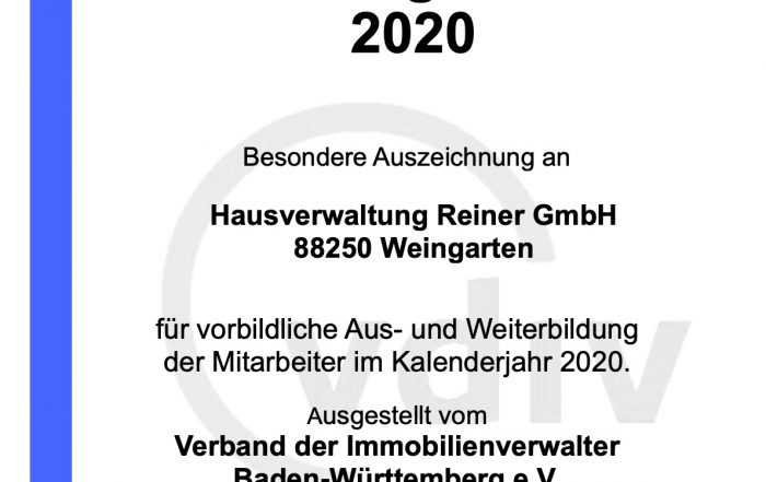 Fortbildung: Partnerschaft mit dem VDIV BW und Fortbildungszertifikat 2020 Dank und Einordnung Wir bedanken uns beim Verband der Immobilienverwalter Baden-Württemberg e. V. (VDIV BW) für die langjährige, partnerschaftliche [...]